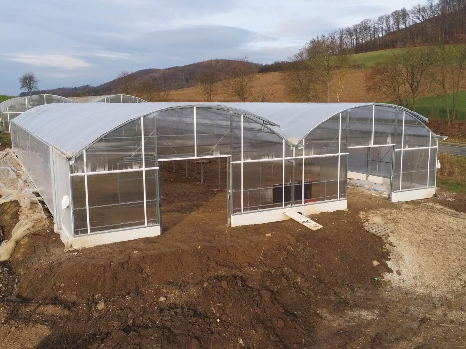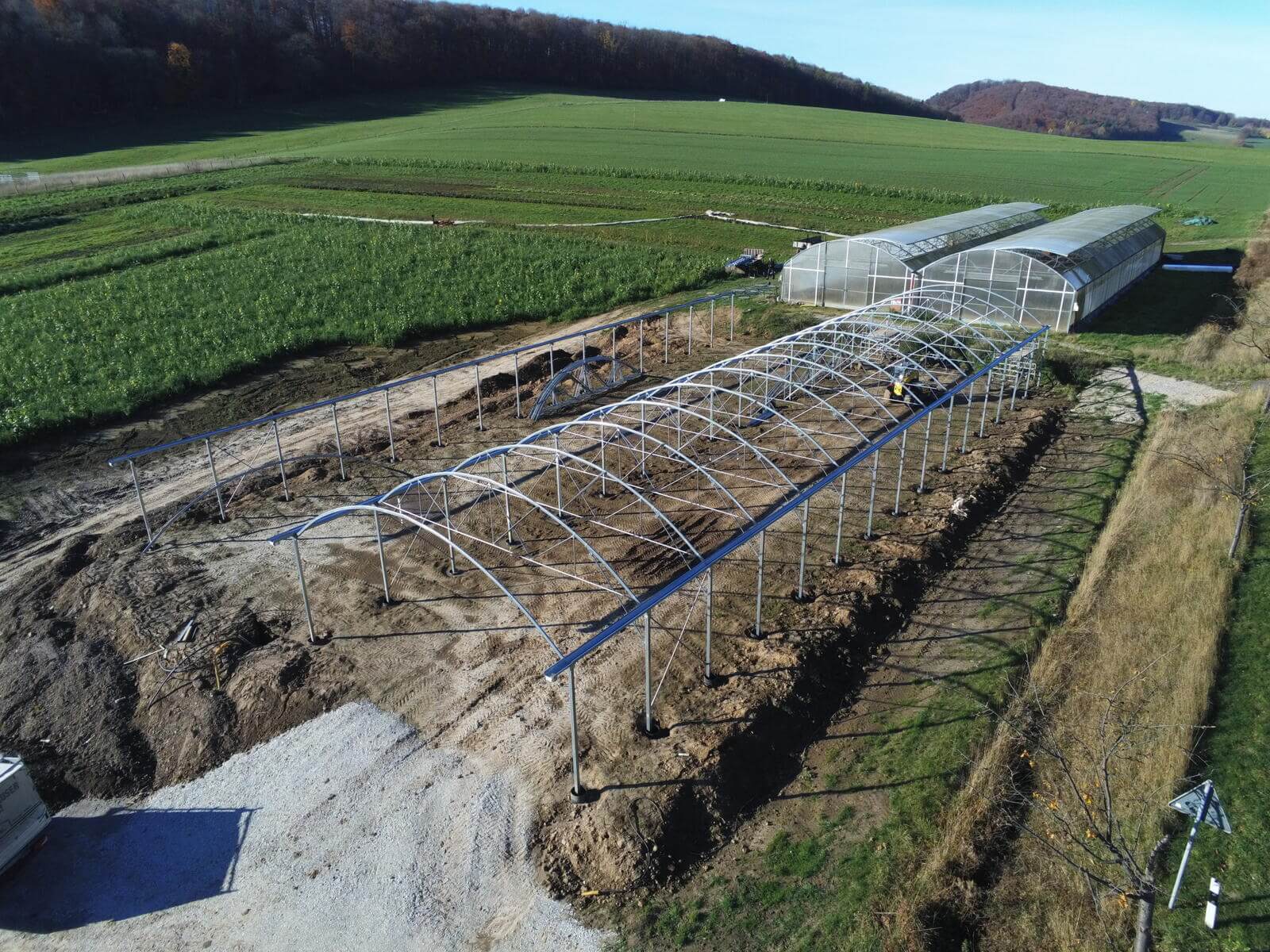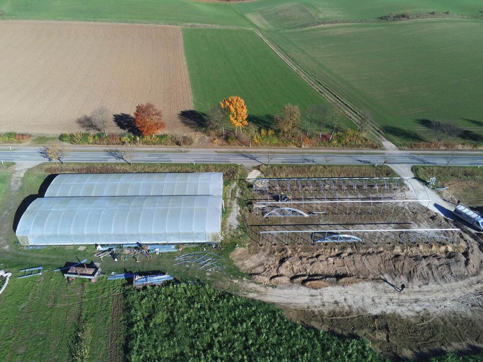 Neubau von einem Richel-Folienblock Typ 960R250ov90 – 2 Schiffe 9,60 m x 37,50m – Gemüsebau Bertram, Freden